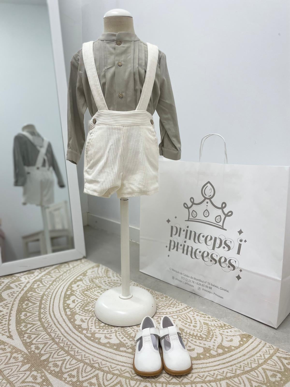 Pantalón cortito de pana blanco con tirantes y camisa en color gris.