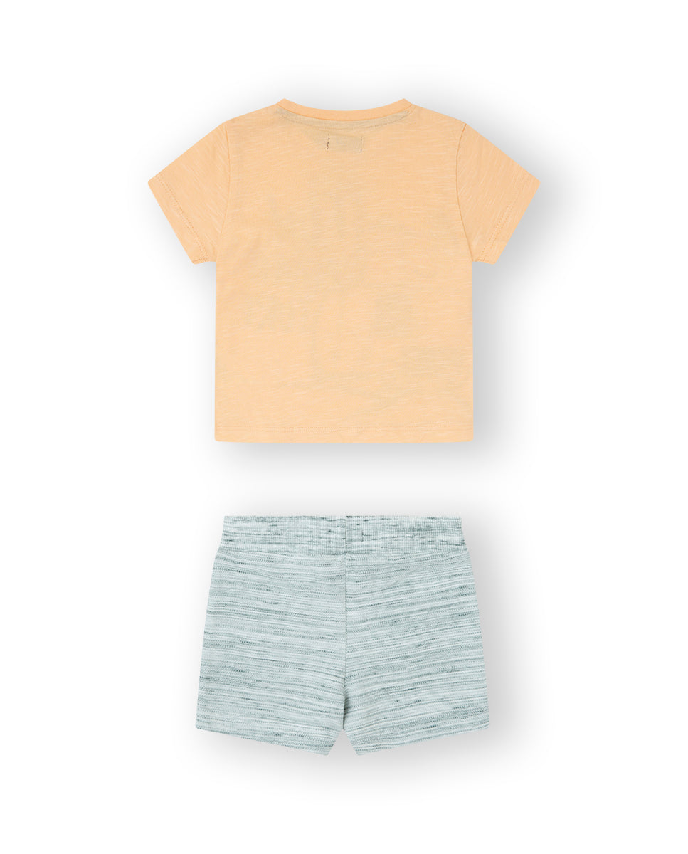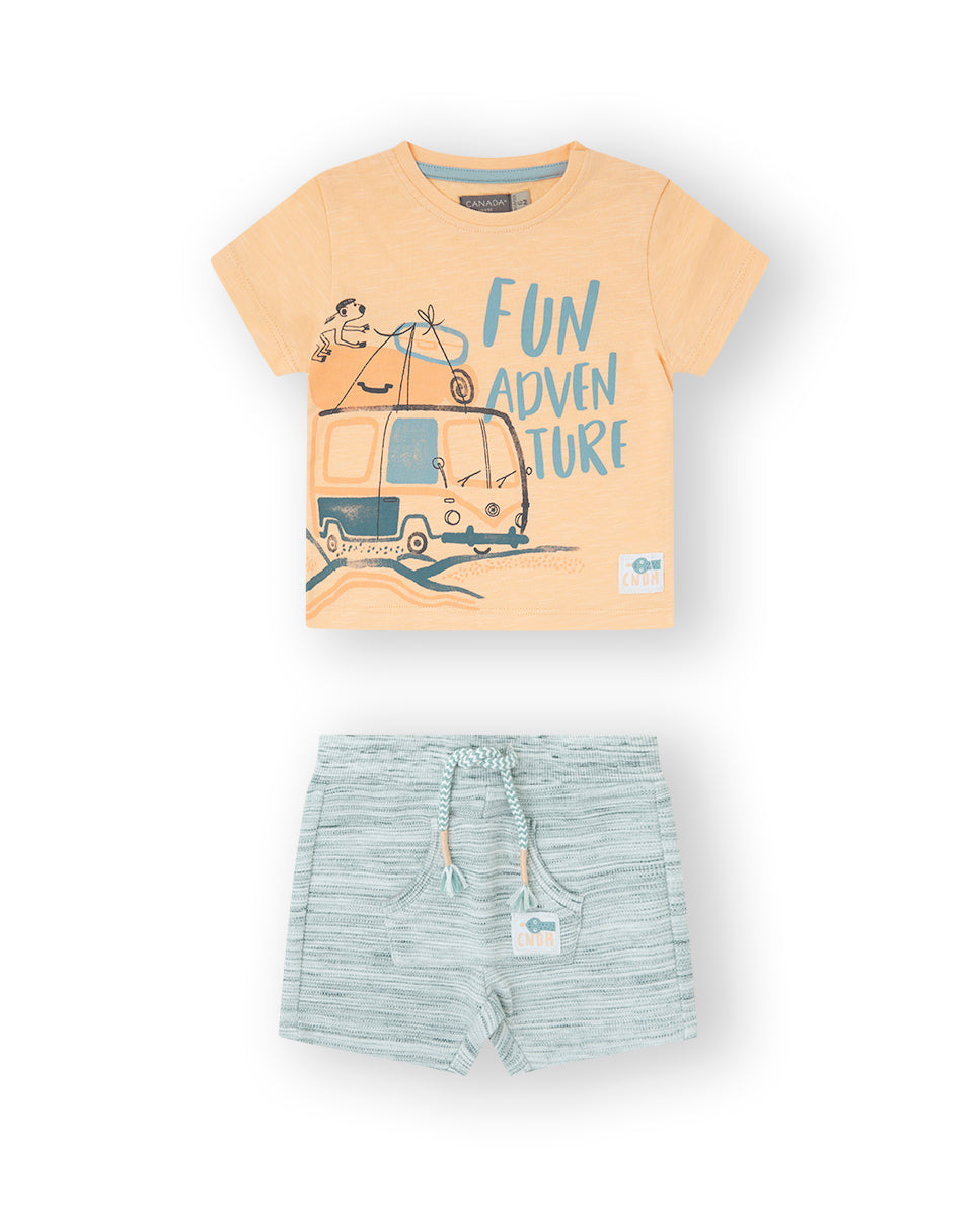 Conjunto dos piezas con camiseta estampada abierta por el hombro con clips y pantalón con goma en la cintura elástica.