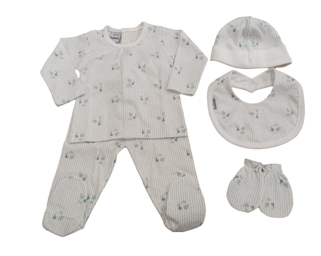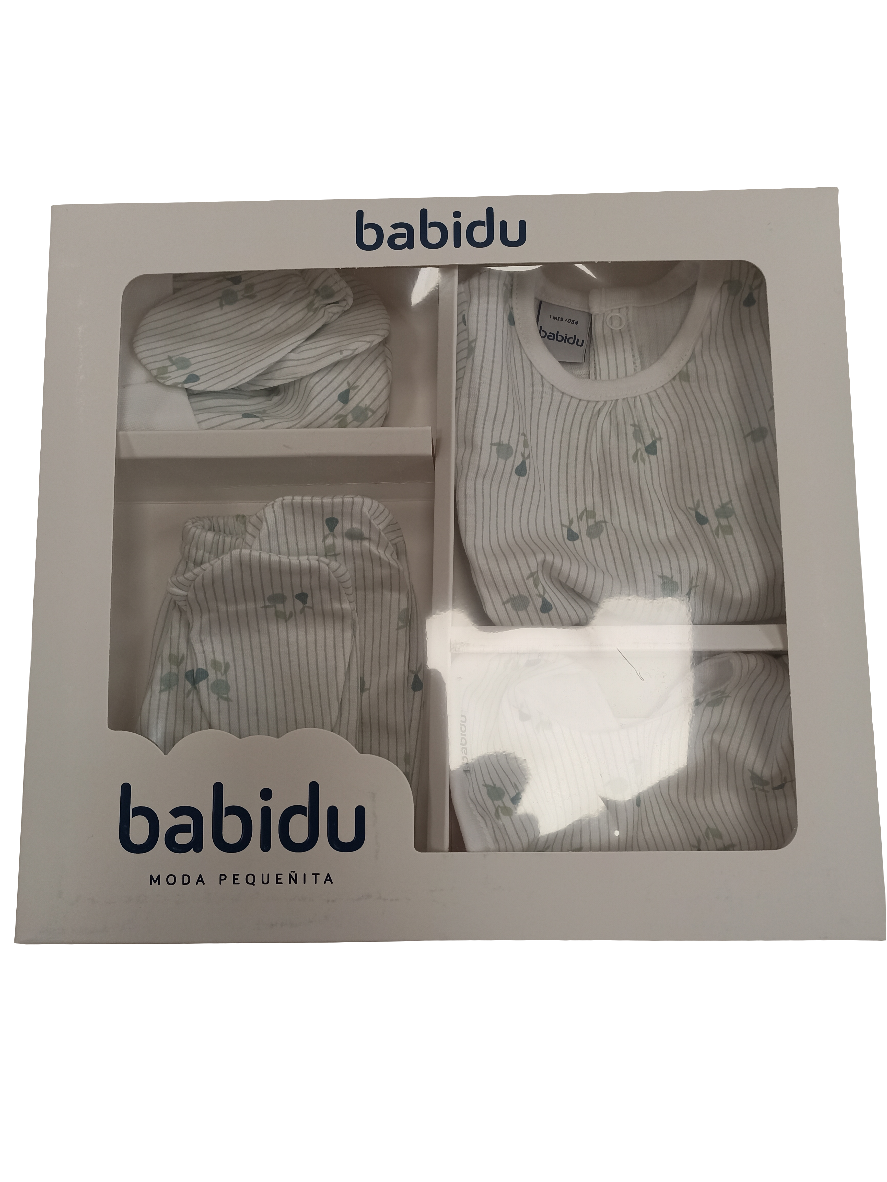 Cajita primera muda compuesto de jubón, polaina, gorrito,manoplas y babero