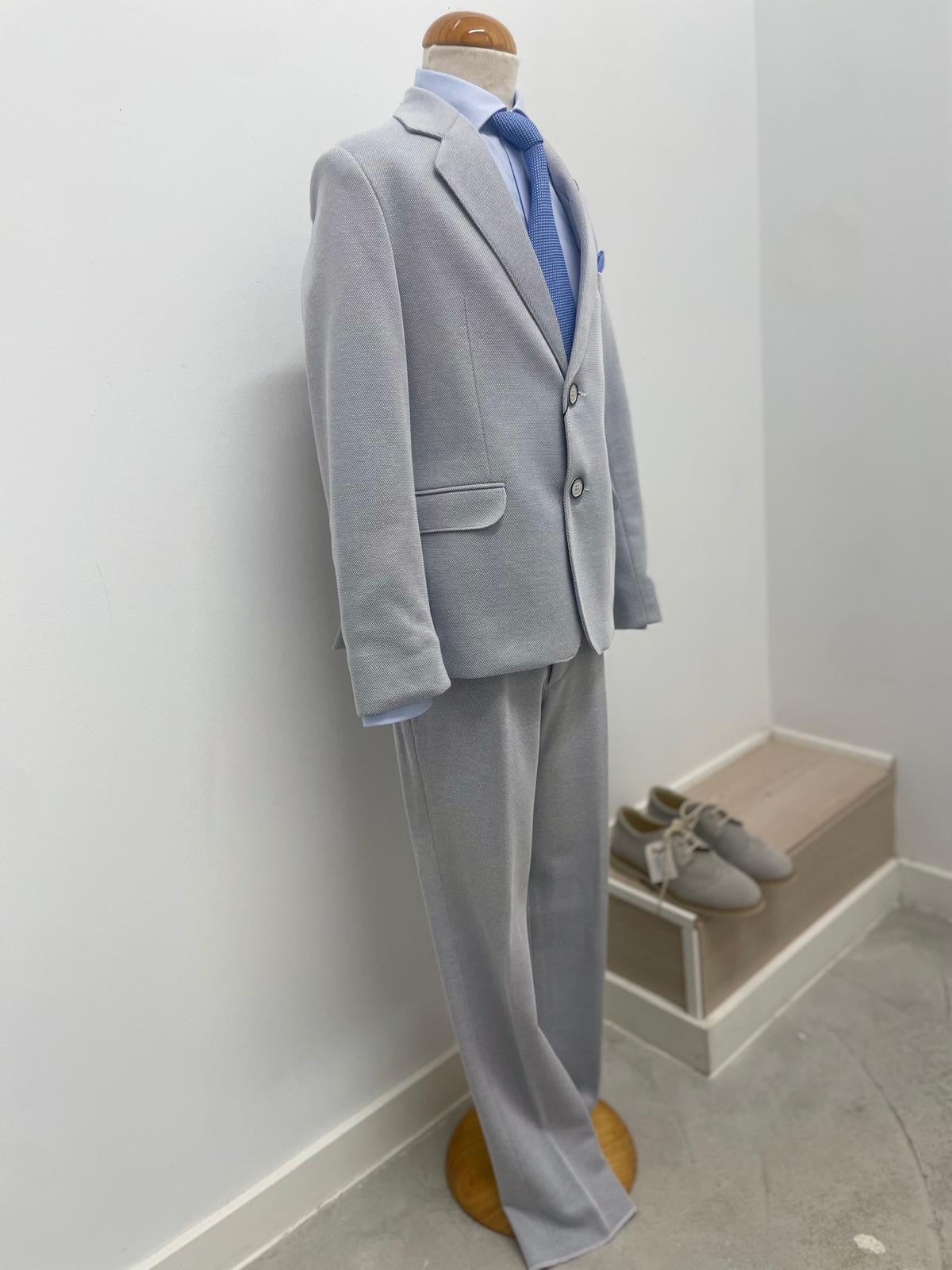 Traje elegante en gris claro compuesto por americana y pantalón perfectamente coordinados, diseñado para que tu hijo brille en comunión y eventos especiales. Completa el look con la camisa celeste incluida, corbata a juego y pañuelo decorativo que añaden un toque sofisticado y diferenciador. Una combinación cromática impecable que transmite distinción y madurez, garantizando que destaque con estilo en cualquier ocasión importante.