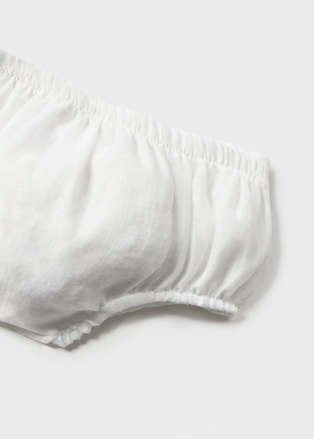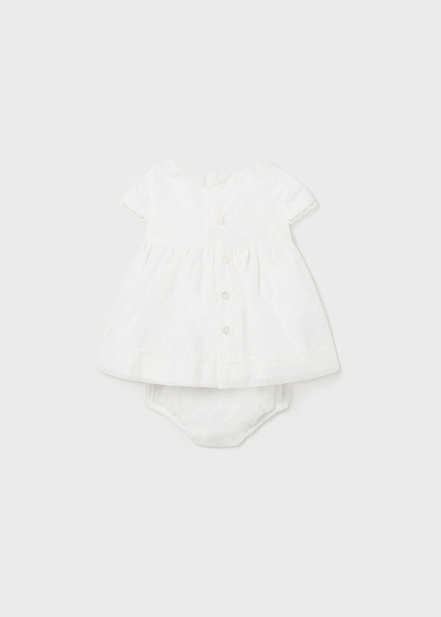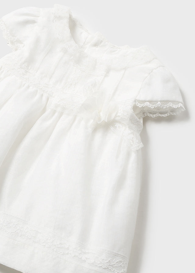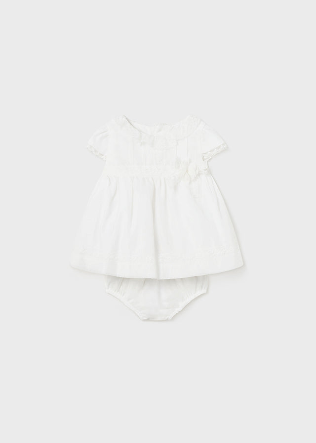 Vestido color nata con blonda y una flor en el lateral, con braguita a juego.